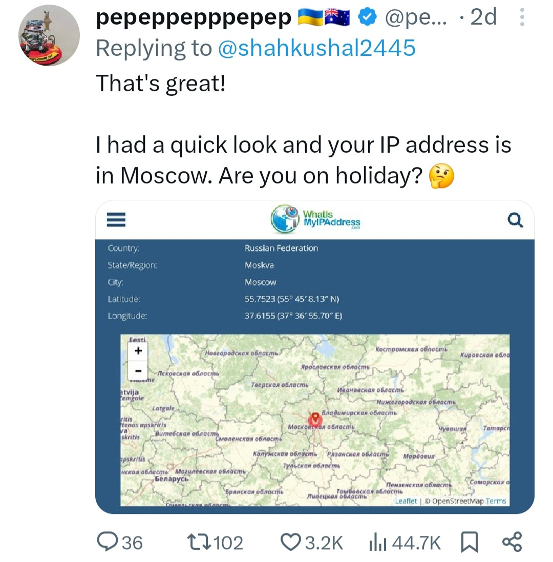 Another person had ran “Amelia’s” post through an IP address finder site and found that the post had originated in Moscow.