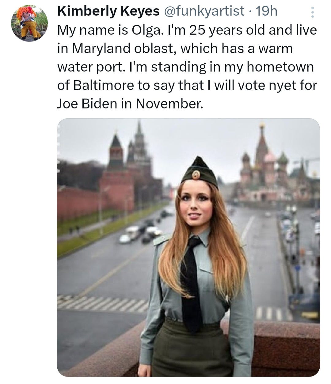 I swiped the picture of “Olga” from an Instagram account that posts photos of Russian army women. (I have a feeling that this account swipes all of those photos from other accounts.) I only mentioned that “Maryland oblast” has a warm water port as a parody of all of those fake Russian bot posts from a few months ago talking about Texas having “warm water ports.” (It would take a separate post to fully describe the topic of Russian troll bots being obsessed with Texas.) Of course anyone with half-a-brain would know that Olga isn't really standing in Baltimore nor would a Baltimore person ever say “nyet” instead of “no” or “nope.”