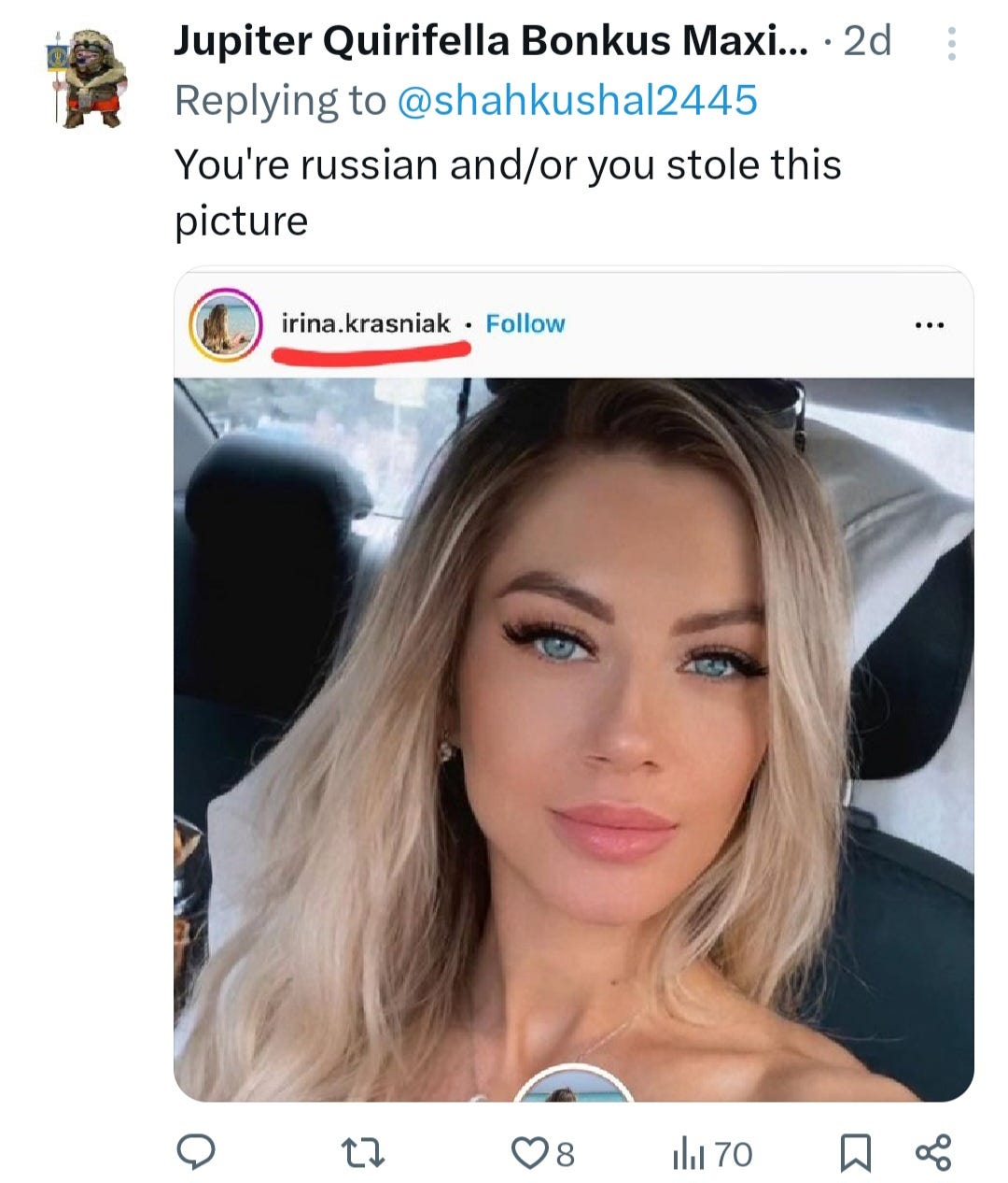 Then more people noticed that the photo that was attached to the original tweet from “Amelia” came from the Instagram account of Irina Krasniak.